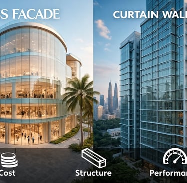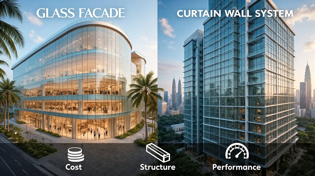Glass facade vs curtain wall: What's the difference? Learn which glazing system suits your commercial building in Malaysia, including cost, structure, and performance comparisons.