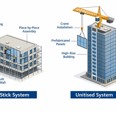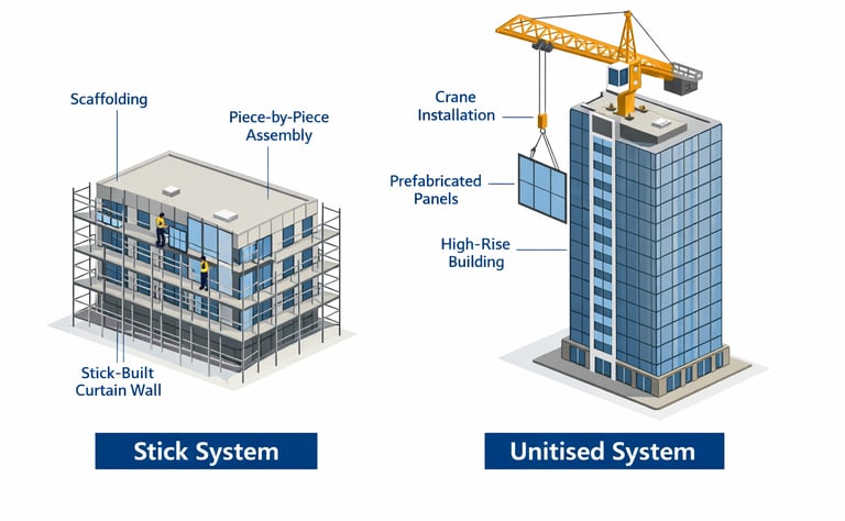 Stick System: Individual components (mullions, transoms, and glass panels) are assembled piece by piece on-site. This is the more traditional method and is commonly used for mid-rise office buildings in Klang Valley.