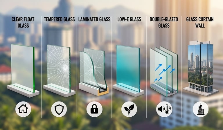1. Clear Float Glass - The most basic and affordable option. Suitable for standard windows, internal partitions, and low-risk applications.